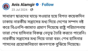ওই স্ট্যাটাসে আনিস আলমগীর লিখেছিলেন, ‘সাধারণ ছাত্রদের ঘাড়ে সওয়ার হয়ে বিগত কয়েকদিন ঢাকায় নারকীয় সন্ত্রাসের মধ্য দিয়ে দেশের সম্পদ নষ্ট করে বিএনপি-জামাত প্রমাণ দিয়েছে, রাষ্ট্র পরিচালনায় তারা শেখ হাসিনার বিকল্প নেতৃত্ব তৈরি করতে পারেনি।’