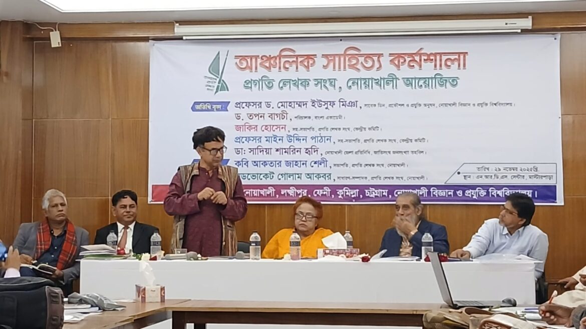 নোয়াখালী প্রগতি লেখক সংঘের আয়োজনে ২৯ নভেম্বর শনিবার মাস্টারপাড়া এন.আর.ডি.এস সেন্টারের হল রুমে আঞ্চলিক সাহিত্য কর্মশালা অনুষ্ঠিত হয়। অনুষ্ঠানে অতিথি হিসাবে উপস্থিত ছিলেন নোয়াখালী বিজ্ঞান ও প্রযুক্তি বিশ্ববিদ্যালয়ের প্রকৌশল ও প্রযুক্তি অনুষদের সাবেক ডিন প্রফেসর ড. মোহাম্মদ ইউছুফ মিঞা, বাংলা একাডেমির পরিচালক ড. তপন বাগচী, প্রগতি লেখক সংঘ কেন্দ্রীয় কমিটির সহ- সভাপতি জাকির হোসেন, সহ-সভাপতি প্রফেসর মাইন উদ্দিন পাঠান ও জাতিসংঘ জনসংখ্যা তহবিল (UNFPA) এর নোয়াখালী জেলা প্রতিনিধি ডা. সাদিয়া শামরিন হৃদি।