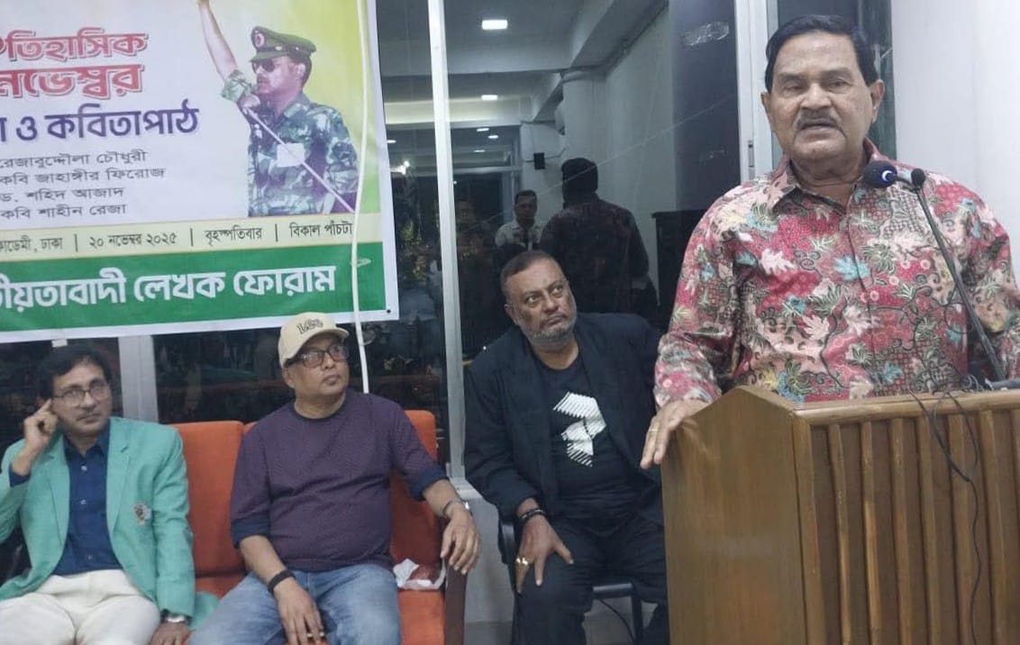 বৃহস্পতিবার ঐতিহাসিক ৭ নভেম্বর উপলক্ষে জাতীয়তাবাদী লেখক ফোরাম আয়োজিত আলোচনা ও কবিতাপাঠ অনুষ্ঠানে প্রধান অতিথির বক্তব্যে তিনি এ কথা বলেন। বাংলা একাডেমির আল মাহমুদ কর্ণারে আয়োজিত এ অনুষ্ঠানে সভাপতিত্ব করেন সংগঠনের সভাপতি কবি শাহীন রেজা। উদ্বোধন করেন বিশিষ্ট কবি ও সাংবাদিক জাহাঙ্গীর ফিরোজ। স্বাগত বক্তব্য দেন ফোরামের সাধারণ সম্পাদক কবি ও শিক্ষাবিদ ড.শহিদ আজাদ।