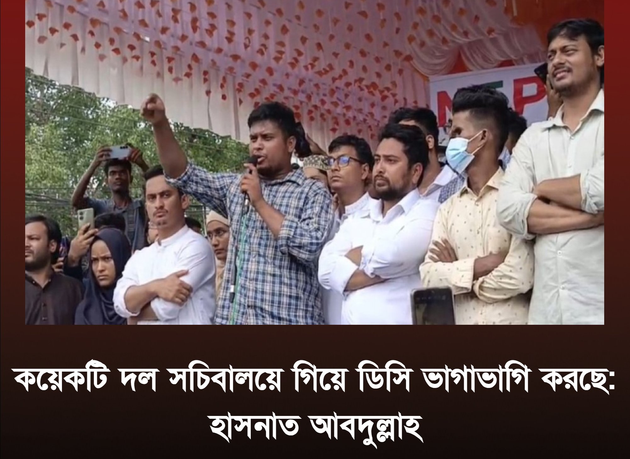 জাতীয় নাগরিক পার্টির (এনসিপি) দক্ষিণাঞ্চলীয় মুখ্য সংগঠক হাসনাত আবদুল্লাহ বলেছেন, সচিবালয়ে গিয়ে কয়েকটি রাজনৈতিক দল জেলা প্রশাসক (ডিসি) ভাগাভাগি করছে। এতে সহায়তা করছে অন্তর্বর্তী সরকার। আগামীতে একটি ইলেকশন ইঞ্জিনিয়ারিংয়ের চেষ্টা চলছে। বর্তমান নির্বাচন কমিশন স্বৈরতান্ত্রিক আচরণ করছে। প্রতিটি রাষ্ট্রীয় প্রতিষ্ঠান দখল করছে দুটি দল। এমনটি চলতে থাকলে জনগণ মেনে নেবে না।