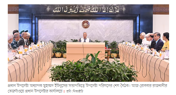 আজ রোববার রাজধানীর তেজগাঁওয়ে প্রধান উপদেষ্টার কার্যালয়ে প্রধান উপদেষ্টা অধ্যাপক মুহাম্মদ ইউনূসের সভাপতিত্বে উপদেষ্টা পরিষদের শেষ বৈঠক অনুষ্ঠিত হয়। বৈঠক শেষে রাজধানীর ফরেন সার্ভিস একাডেমিতে বৈঠকের আলোচ্য বিষয় জানাতে আয়োজিত সংবাদ সম্মেলনে সাংবাদিকদের প্রশ্নের উত্তরে উপদেষ্টাদের নিয়ে কথা বলেন প্রেস সচিব।