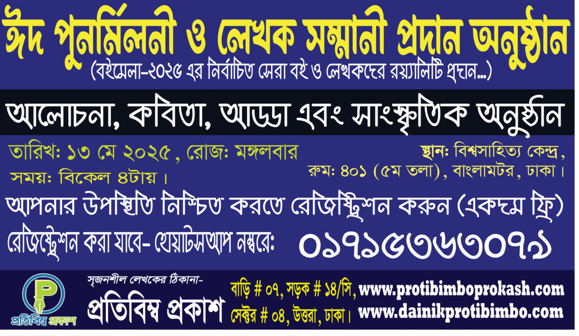 আগামী ১৩ মে ২০২৫ অনুষ্ঠিত হচ্ছে, প্রতিবিম্ব প্রকাশ: ঈদ পুনর্মিলনী ও লেখক সম্মানী/রয়্যালটি প্রদান অনুষ্ঠান।