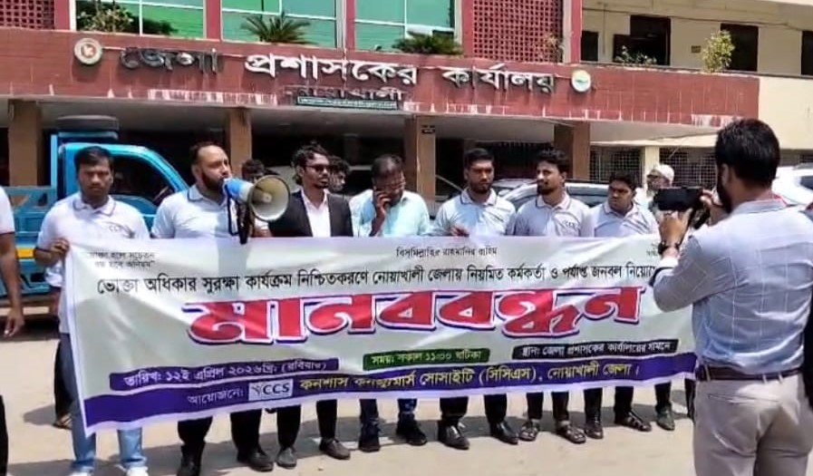 ভোক্তা অধিকার সুরক্ষায় নোয়াখালী জেলায় নিয়মিত কর্মকতা ও পর্যাপ্ত জনবল নিয়োগের দাবিতে কনশাস কনজ্যুমার্স সোসাইটি (সিসিএস) নোয়াখালী জেলার মানববন্ধন অনুষ্ঠিত হয়েছে। সিসিএস নোয়াখালী জেলা কো-অর্ডিনেটর অ্যাডভোকেট ওমর ফারুক খালেদ-এর সভাপতিত্বে ও অ্যাডভোকেট ফোরকানুল আলম এর সঞ্চালনায় উক্ত মানববন্ধনে বক্তব্য রাখেন নোয়াখালী জেলা কো-অর্ডিনেটর মোঃ ওমর ফারুক খালেদ, সঞ্চালনায় মাসুদ পারভেজ, অন্যান্যদের মধ্যে বক্তব্য দেয় উক্ত পোগ্রাম বাস্তবায়ন কমিটির আহবায়ক রফিকুল ইসলাম রবি, লক্ষ্মীপুর জেলা কো-অর্ডিনেটর আবুল হাসান সহেল, আবু আবদুল্লাহ জিহান, মোবারক হোসেন রুবেল, হারুনুর রশিদ, মুজাহিদুল ইসলাম সহ অন্যান্য স্বেচ্ছাসেবকবৃন্দ। সিসিএস নোয়াখালী জেলা কো-অর্ডিনেটর অ্যাডভোকেট ওমর ফারুক খালেদ বলেন বাজারে তদারকি অভিযান নির্বিঘ্নভাবে পরিচালনার লক্ষ্যে নোয়াখালী জেলায় ভোক্তা অধিকারের নিয়মিত কর্মকর্তা ও পর্যাপ্ত জনবল নিয়োগ প্রদান করে ভোক্তা অধিকার সংরক্ষন আইন ২০০৯-এর পূর্ণাঙ্গ ও কার্যকর প্রয়োগ নিশ্চিত করতে হবে। তিনি আরও বলেন নোয়াখালীতে নিয়মিত কর্মকর্তা না থাকার সুযোগে সক্রিয় হয়ে উঠেছে বাজার সিন্ডিকেট। এতে ভোক্তাদের স্বার্থ মারাত্মক ভাবে ক্ষতিগ্রস্থ হচ্ছে। তাৎক্ষনিক আইনানুগ ব্যবস্থা গ্রহন করা যাচ্ছে না।