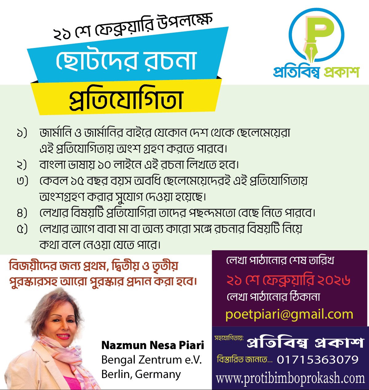 ৪) লেখার বিষয়টি প্রতিযোগিরা তাদের পছন্দমতো বেছে নিতে পারবে।